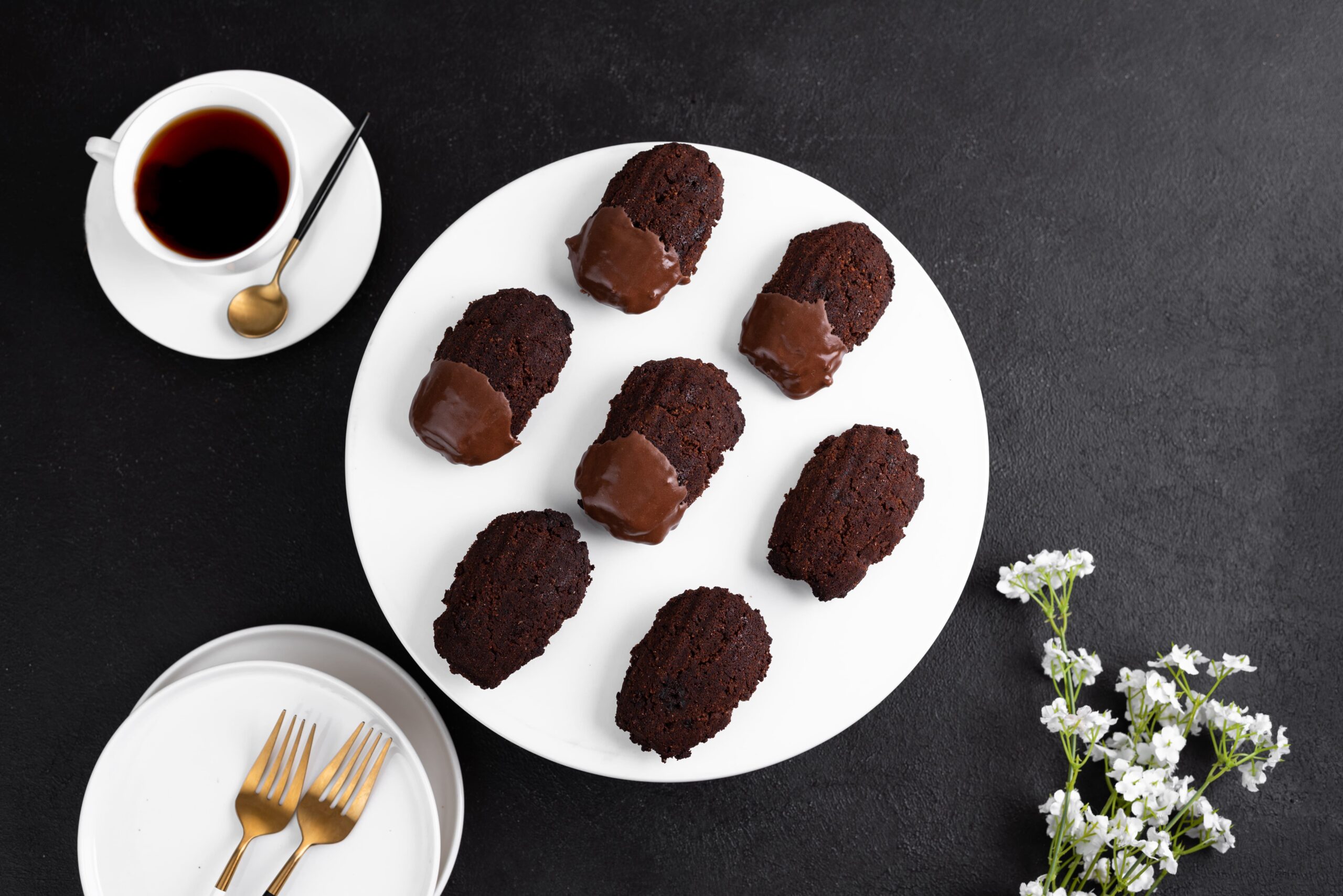 - Madeleine Base: A moist and fluffy chocolate sponge made with gluten-free flour blend, real cocoa powder, and a hint of pure butter for an indulgent taste.